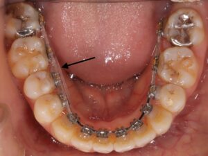 この隙間をまた閉じていくために、右下の奥歯から前歯にかけてゴムを掛けました。